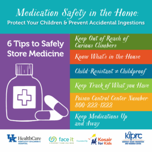 In collaboration with the Kentucky Children’s Hospital (KCH) and Kentucky Injury Prevention and Research Center (KIPRC), the Kosair for Kids Face It Movement offers a free resource, Medication Safety in the Home: Protect Your Children & Prevent Accidental Ingestions, for families and professionals who work with families featuring tips to safely store medicine and prevent tragedies.