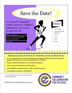 SAVE-THE-DATE for the 1st Annual Statewide Community Collaboration for Children out of Western KY Child Abuse Awareness Month kick off event on March 26th in Frankfort.