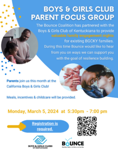 The Bounce Coalition has partnered with the Boys & Girls Club of Kentuckiana to provide valuable family engagement nights for existing BGCKY families. During this time Bounce would like to hear from you on ways we can support you with the goal of resilience building.Monday, March 4th, 2024 at 5:30 Dinner, Programming at 6pm – 7pm