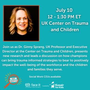 Join the next Curiosity Club meeting on Wednesday, July 10th at 12:00 PM. Dr. Ginny Sprang, UK Professor and Executive Director at the Center on Trauma and Children, will present new research and lead a discussion on how champions can bring trauma informed strategies to bear to positively impact the well-being of the workforce and the children and families they serve. Social Work CEU’s available. Register.