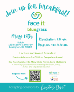 Join the Kosair for Kids Face It Movement Bluegrass team for a Lecture and Award Breakfast and presentation of the Fearless Advocate for Children Everywhere (FACE) Award. Our Key Note Speaker: Dr. Mary Clyde Pierce, Lurie Children’s, will present a learning opportunity connecting the brain, body, mind, and impact of trauma. Register.