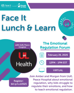 Join Amber and Morgan from UofL Peace Hospital on February 25 at 12PM EST for a virtual Lunch and Learn on emotional regulation, why kids struggle to regulate their emotions, and how to teach emotional regulation. Register here.