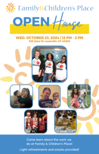 Join us for an Open House on Wednesday, October 23rd from 12:00 pm – 2:00 pm at our Family Service Center (525 Zane St., Louisville, 40203). Attendees will get the chance to tour our nationally recognized Child Advocacy Center, meet with various program staff to learn about the services they provide to our clients, and learn more about our work to protect and heal children and families.