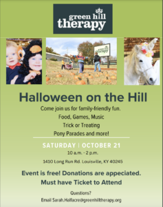 Join Green Hill Therapy on Saturday October 21 for their Halloween on the Hill Event. FREE to kids and families that attend. Learn more.