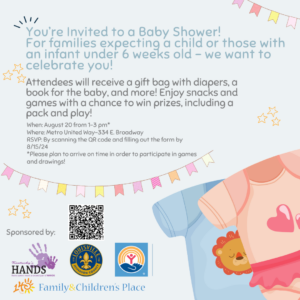HANDS is hosting a community baby shower in collaboration with Metro United Way on August 20, 2024 1-3 p.m. at Metro United Way, 334 E. Broadway | Louisville, KY 40202 Families MUST RSVP to attend.