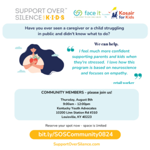 Join Support Over Silence for Kids and the Kosair For Kids Face It Movement for a bystander training that will prepare you to confidently provide support during a challenging moment between a caregiver and their child in public. The training consists of six interactive modules that teach the importance of this support and allows you to practice the skills needed to engage with caregivers and kids in a non-judgmental way. Register.