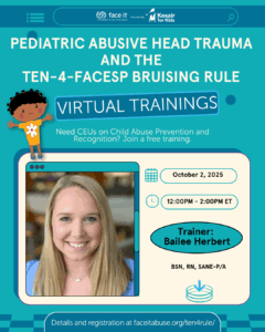 Join the Kosair For Kids Face It Movement for a FREE virtual training on Pediatric Abusive Head Trauma prevention and recognition and the TEN-4-FACESp Bruising Rule with Bailee Herbert, BSN, RN, SANE-P/A. This event is virtual via Zoom.