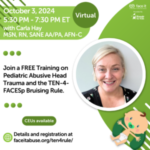 Join the Kosair For Kids Face It Movement for a FREE virtual training on Pediatric Abusive Head Trauma prevention and recognition and the TEN-4-FACESp Bruising Rule with Carla Hay, MSN, RN, SANE, Pediatric Forensic Nurse at Kentucky Children’s Hospital.
